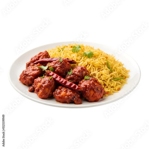 Chilli Chicken with Pulao on White Plate isolated on a transparent background