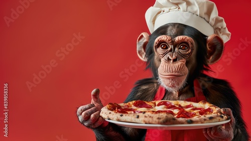 Chimpanzee Chef Holding Pizza Against Red Background - Unique Animal Culinary Concept