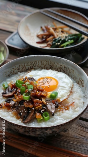 breakfast, egg, soy sauce, chinese cuisine, comfort food, dining, traditional, warm, savoury, favor, ingredient, culinary, nourishing, wholesome, meal, green onion, mushroom, sesame seeds, asian culture, wooden table, tasty, hearty, delicious, inviting, food preparation, flavorful, morning meal