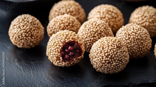 chinese, fried, sesame, ball, red, bean, filling, black, background, bold, contrast, healthy lifestyle, health food, natural food, organic food, balanced diet