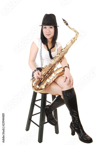 woman, chinese, saxophone, musician, instrument, entertainment, brass, beauty, art, attractive, beautiful, black, elegant, fashion, female, girl, glamour, gold, hand, hat, isolated, jazz, lady, model, perform, performer, person, play, playing, pleasure, popular, portrait, pretty, sax, saxophonist, sexy, sound, studio, style, talent, white, young, short, background, bar, chair, asian, boot
