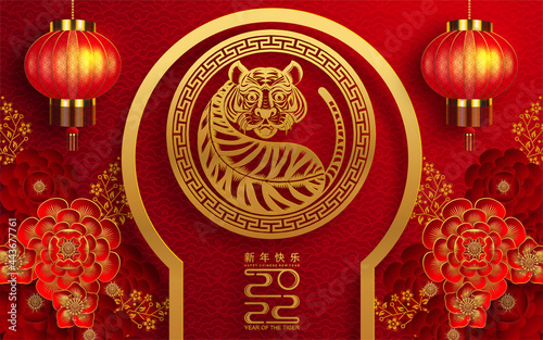 Chinese new year 2022 year of the tiger red and gold flower and asian elements paper cut with craft style on background.( translation : chinese new year 2022, year of tiger )