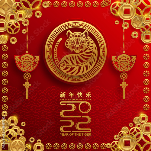 Chinese new year 2022 year of the tiger red and gold flower and asian elements paper cut with craft style on background.( translation : chinese new year 2022, year of tiger )