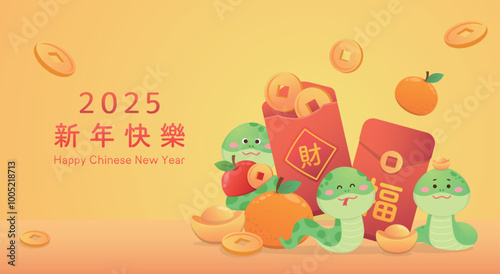 Chinese New Year, cute mascot of snake, gold coins and oranges, poster or greeting card, translation: Happy New Year