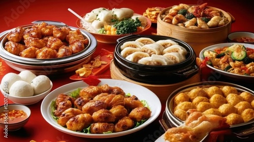 new, year, family, dinner, feast, fish, ball, stuffed, bun, red, table, setting, lunar, festivity, atmosphere, celebration, reunion, food, culture, tradition, symbol, holiday, event, background, style, occasion, decor, gathering, love, togetherness, warmth, festive, season, cultural, eve, lantern, prosperity, luck, dumpling, culinary