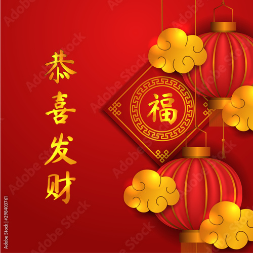 chinese new year poster banner template, red and golden lucky signage and hanging lantern