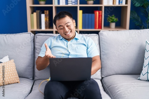 Chinese young man using computer laptop sitting on the sofa celebrating achievement with happy smile and winner expression with raised hand