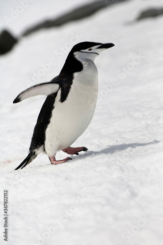 Chinstrap penguin (Pygoscelis Antarctica) walking up a glacial ice cap, Half Moon Island, South Shetland Island, Antarctic Peninsula