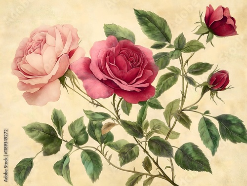 Chintz-style floral pattern with pink and red roses, green leaves, cream background, vintage texture