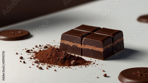 Chocolate bar, candy sweet, cacao beans and powder on wooden background