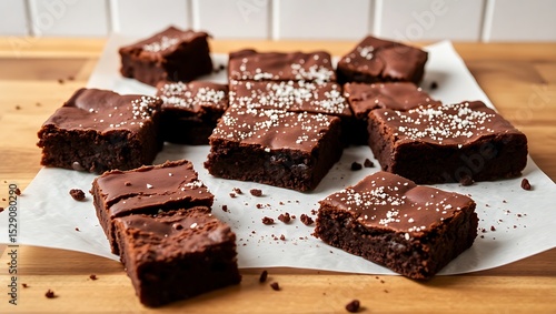 Chocolate brownies cut into perfect squares on parchment paper with crumbs scattered around, minimal kitchen background, warm tones