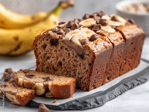 Chocolate Chip Banana Bread Loaf, Freshly Baked Banana Bread Slice