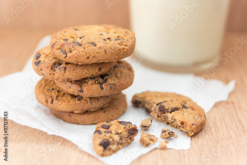 Chocolate chip cookies and a glass of milk on a wooden background.