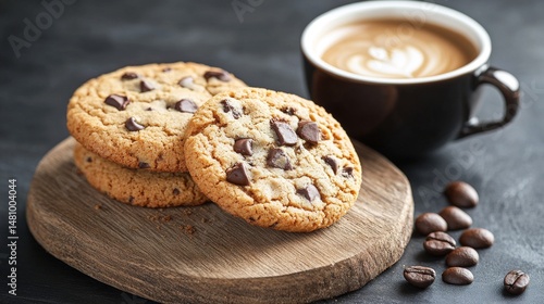 cookie, chocolate, chips, stack, wooden, board, cup, hot drink, goggles, dessert, food, snack, baked, treat, sweet, dark, brown, background, surface, bakery, delicious, tasty, espresso, refreshment, table, wood, beverage, favor, aroma, culinary, indulgence, cafes, epicure, nobody, blurred, homemade, soft, indoor, sharpened, drink, fresh, caffeine, cookery, breakfast