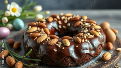 chocolate, dessert, glaze, almond, nut, cake, festive, spring, easter, decoration, wooden, surface, colourful, egg, flower, round, sweet, bakery, pastry, epicure, celebration, homemade, treat, rustic, indulgence, receipe, party, brunch, delicious, design, springtime, seasonal, special occasion, mouth-watering, presentation, texture, delightful, appetising, creative, favor, party food