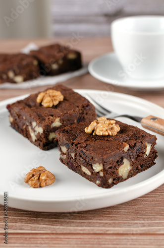 Chocolate homemade brownies with dried cranberries and walnuts on the white plate with a cup of black tea