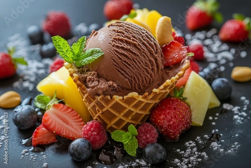 Chocolate ice cream in waffle cone served with assorted fruits, cashew brownie fudge cake and with generative ai