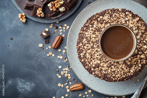 cake, chocolate, oatmeal, hot drink, cup, nut, pecan, plate, dark, sweet, food, brown, delicious, dessert, tasty, crumb, granola, sprinkle, baking, homemade, epicure, breakfast, snack, treat, indulgent, chocolate, creamy, decadent, savoury, healthy, energy, morning, fresh, simple, grey, top, view, closeup, overhead, studio, photo, still life