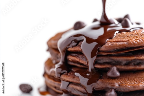 Chocolate Pancakes Piled Up with Fresh Chocolate Drizzle Close Up