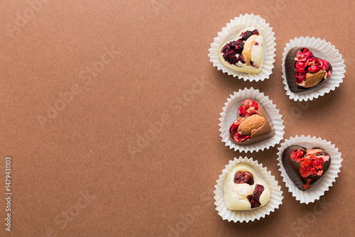 chocolate sweets in the form of a heart with fruits and nuts on a colored background. top view with space for text, holiday concept