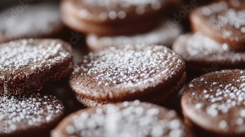 chocolate-dipped cookies dusted with icing sugar, the rich cocoa and white powder contrasting beautifully in 4K detail