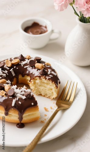 Chocolate-Glazed Donut with Peanut Butter Chips and Coconut Shavings – Gourmet Dessert Presentation