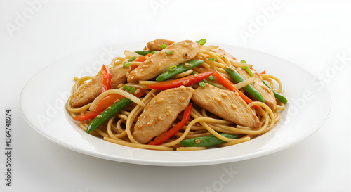 Chow Mein recipe close up illustration. Served dish on the plate with two sticks. Chinese food for menu, restaurants, banners, design.