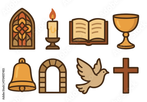 Christian symbols: stained glass, candle, bible, chalice, bell, arch, dove, cross