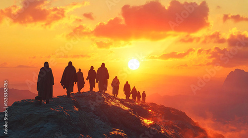 Christianity, sunrise and people on mountain with Jesus for religion, spiritual teaching and bible story. Gospel, prophet and men and women walking together for faith, belief and worship with God
