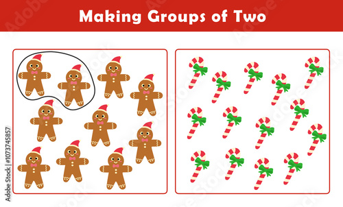 Christmas activity sheet. Making Groups of Two Worksheet. Grouping Picture Math Activity for Kids. Fun Math Activity for Children.