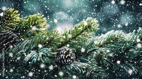 Christmas and New Year background with fir branches, pine cones and snow.generative ai