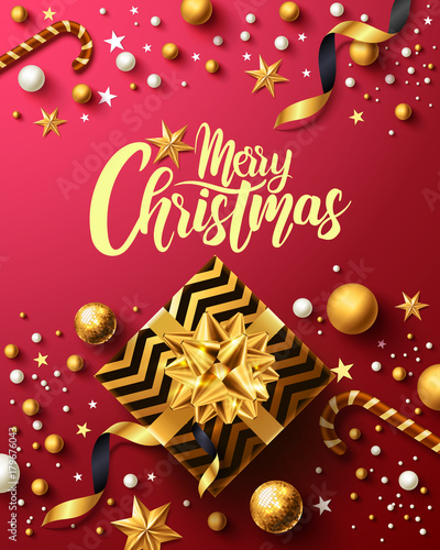 Christmas and New Years Red Poster with golden gift box,ribbon and christmas decoration elements for Retail,Shopping or Christmas Promotion in golden and red style.Vector illustration