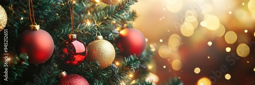 Christmas background featuring a close - up of a decorated tree with red and gold ornaments