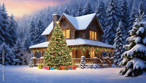 Christmas background with a decorated house, gifts, Christmas tree and string lights. New year and xmas ideas.