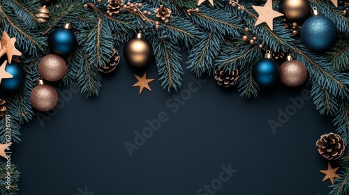 Christmas background with decorations along the edges. Christmas tree branches, gold glitter balls, stars, and garland. Flat lay, top view on a dark background with copy space.
