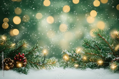 Christmas Background with Snow and Lights, Blurred Pine Branches and Garland Decorations. Festive Green Color Palette with Bokeh Effect.