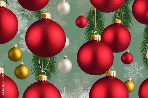 Christmas balls on the Christmas tree, snowflakes in the background