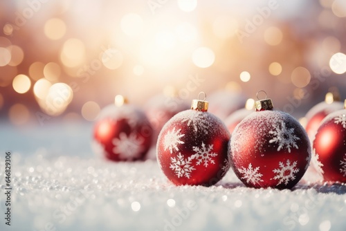 Christmas baubles decoration, Christmas balls on snow closeup, bokeh lights background