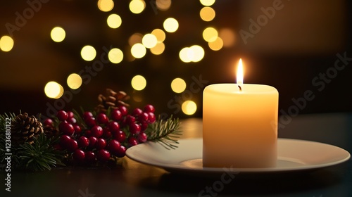 Christmas candle on table with bokeh lights in background, space for text stock photo contest winner, christmas dinner place setting, warm and inviting, candlelight, romantic atmosphere,