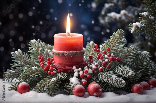 christmas, winter, holiday, greeting, card, new, year, new year, candle, decoration, celebration, christmas, tree, flames, fire, light, ball, ornament, season, candlelight, advent, snow, tree branch, candle, burning, red, decor, december, gold, pine, chaplet, ribbon