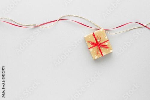 Christmas composition. Gift ribbon rope top view background with copy space for your text. Flat lay.