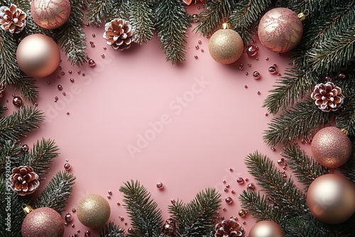 Christmas composition with green pine branch, pink and golden decorations and balls, confetti on pink background with copy space. Top view.