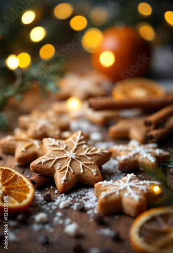 Christmas cookies, cinnamon sticks, and dried orange slices on a wooden surface with holiday lights.
