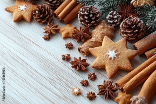 Christmas cookies decorated with stars, cinnamon, and pine cones create a festive winter atmosphere