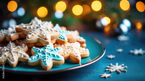 cookie, icing, sugar, star, christmas, decoration, blue, celebration, gingerbread, sweet, edible, treat, plate, seasonal, white, glaze, anise, spice, aroma, baking, dessert, festive, tradition, yellow, light, bokeh, snack, delicious, homemade, confectionery, winter, gold, pastry, holiday, food, ornate, frosted, decorated, epicure, tasty, cinnamon, favor, vanilla, background, culinary, craftsmanship, baked, cookery, snowflake