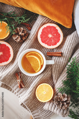 Christmas cozy winter home decor. New year still life: cup of citrus tea, oranges, grapefruits, cinnamon sticks, pine cones, fir branches, knitted sweater. Flat lay, top view.