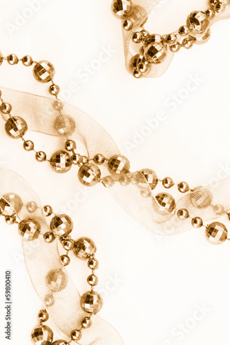 christmas, garland, holiday, decoration, winter, celebration, background, christmas, gift, seasonal, ornament, festive, present, design, ribbon, ball, abstract, texture, wallpaper, object, pearl, christmas decoration, christmas ornament, shiny, tradition, closeup, macro, bead, textile, fabric, shining, lustrous, yellow, brown, sepia, white, gold