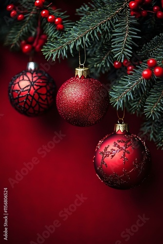Christmas decoration elements on red backround. Christmas ornament. Copy space.