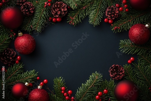 christmas, decoration, arrangement, red, ornament, pine, branch, berry, black, background, festive, holiday, warmth, celebrate, elegant, cosy, season, festivity, traditional, top, view, flat, dark, creative, gift, merry, winter, warm, stylish, new, december, tree, cone, bauble, toy, berry, frame, chaplet, star, trendy, happy, greeting, seasonal, celebration