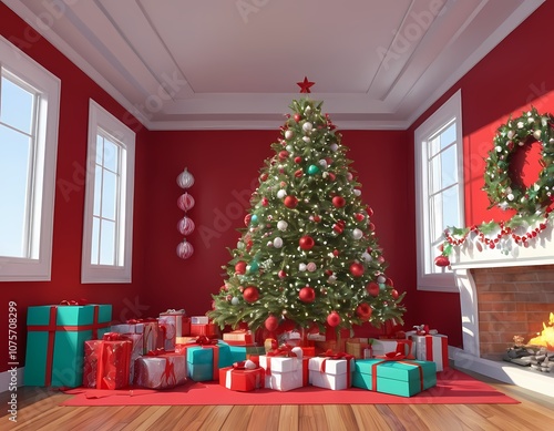 Christmas decorations featuring a beautifully adorned tree, vibrant presents, and a cozy fireplace